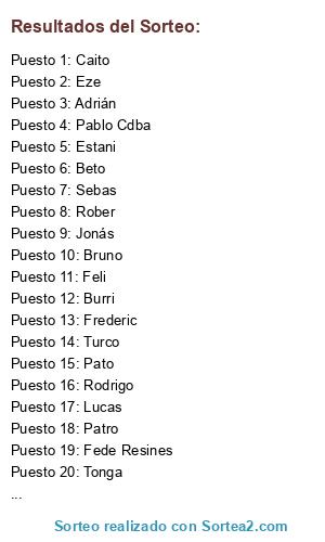 Lista de participantes: Fede Resines, Nacho, Jonás, Patro, Luciano, Bruno, Tonga, Adrián, Pantera, Caito, Pablo Cdba, Feli, Sebas, Eze, Estani, Diego, Axel, Juampy, Pato, Rober, Beto, Josias, Milton, Burri, Rodrigo, Turco, Nico, Facu, Heredia, Luis, Frederic, Lucas.