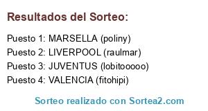 Lista de participantes: VALENCIA (fitohipi), LIVERPOOL (raulmar), JUVENTUS (lobitooooo), MARSELLA (poliny).