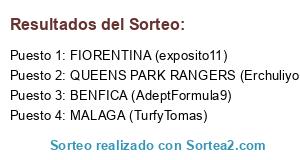 Lista de participantes: MALAGA (TurfyTomas), QUEENS PARK RANGERS (Erchuliyo 24), FIORENTINA (exposito11), BENFICA (AdeptFormula9).