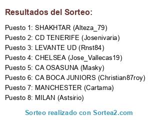 Lista de participantes: SHAKHTAR (Alteza_79), CA BOCA JUNIORS (Christian87roy), MILAN (Astsirio), CHELSEA (Jose_Vallecas19), LEVANTE UD (Rnst84), MANCHESTER (Cartama), CA OSASUNA (Masky), CD TENERIFE (Josenivaria).
