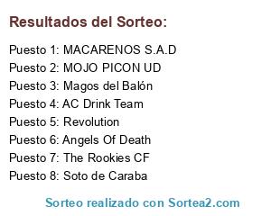 Lista de participantes: Magos del Balón, MACARENOS S.A.D, AC Drink Team, Angels Of Death, MOJO PICON UD, Revolution, The Rookies CF, Soto de Caraba.