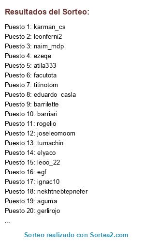 Lista de participantes: leonferni2, leoo_22, jorben, lyly_te_amo, rubencapo, naim_mdp, facutota, maicon3grecia, nekhtnebtepnefer, dionisios17, tumachin, toritocrc, flito, karman_cs, barriari, ezeqe, nikocs81, ignac10, aguma, chiquito72, gerlirojo, joseleomoom, atila333, barrilette, eduardo_casla, azerox, titinotom, rogelio, rodrirocha94, elyaco, lapuntu, egf.