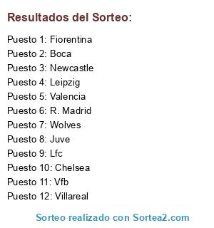 Lista de participantes: Newcastle, Villareal, Wolves, Juve, Leipzig, Fiorentina, Vfb, Boca, Lfc, Valencia, Chelsea, R. Madrid.