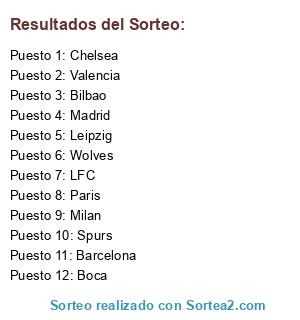 Lista de participantes: Leipzig, Milan, Chelsea, Madrid, LFC, Barcelona, Bilbao, Boca, Wolves, Valencia, Paris, Spurs.
