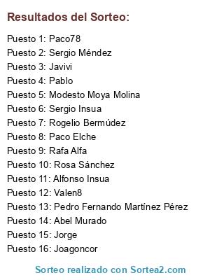 Lista de participantes: Rafa Alfa, Paco78, Modesto Moya Molina, Pedro Fernando Martínez Pérez, Sergio Méndez, Sergio Insua, Rosa Sánchez, Abel Murado, Paco Elche, Pablo, Valen8, Joagoncor, Alfonso Insua, Javivi, Jorge, Rogelio Bermúdez.