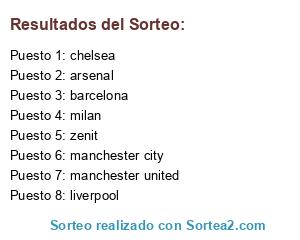 Lista de participantes: manchester united, zenit, chelsea, liverpool, barcelona, manchester city, milan, arsenal.