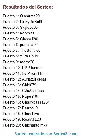 Lista de participantes: Adomitis, Checo l20l, Chicharito mx7, x Paulin04, RealATL23, Oscarms20, Fs Prior i11i, TheBuffalo0, RickyRoBal9, PPP tanque, Papu i10i, pumista02, Chuy Rys, Barron l9l, CJuAnaToss, Chiri079, Auriazul cesar, Charlybass1234, morro26, Skyloco06.