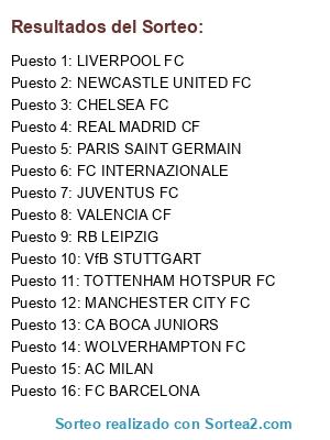 Lista de participantes: NEWCASTLE UNITED FC, MANCHESTER CITY FC, JUVENTUS FC, VfB STUTTGART, RB LEIPZIG, AC MILAN, CHELSEA FC, REAL MADRID CF, LIVERPOOL FC, FC BARCELONA, FC INTERNAZIONALE, CA BOCA JUNIORS, WOLVERHAMPTON FC, VALENCIA CF, PARIS SAINT GERMAIN, TOTTENHAM HOTSPUR FC.