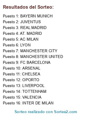 Lista de participantes: OPORTO, LYON, BAYERN MUNICH, JUVENTUS, AC MILAN, INTER DE MILAN, LIVERPOOL, ARSENAL, MANCHESTER CITY, MANCHESTER UNITED, CHELSEA, TOTTENHAM, VALENCIA, AT. MADRID, REAL MADRID, FC BARCELONA.