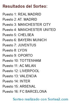 Lista de participantes: OPORTO, LYON, JUVENTUS, AC MILAN, INTER, BAYERN MUNICH, LIVERPOOL, TOTTENHAM, MANCHESTER CITY, MANCHESTER UNITED, CHELSEA, ARSENAL, VALENCIA, AT. MADRID, REAL MADRID, FC BARCELONA.