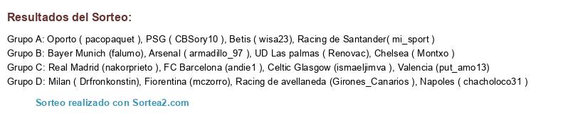 Lista de participantes: PSG ( CBSory10 ), Oporto ( pacopaquet ), Racing de Santander( mi_sport ), Bayer Munich (falumo), Napoles ( chacholoco31 ), Real Madrid (nakorprieto ), Racing de avellaneda (Girones_Canarios ), Fiorentina (mczorro), Milan ( Drfronkonstin), Celtic Glasgow (ismaeljimva ), Betis ( wisa23), UD Las palmas ( Renovac), Arsenal ( armadillo_97 ), FC Barcelona (andie1 ), Chelsea ( Montxo ), Valencia (put_amo13).