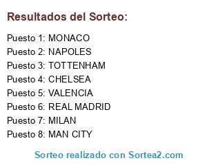Lista de participantes: TOTTENHAM, MAN CITY, VALENCIA, NAPOLES, CHELSEA, MONACO, REAL MADRID, MILAN.