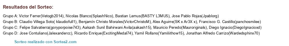 Lista de participantes: Aakash Sunil Bahirwani Avila(aakash15), Alex Aguirre(SK x Ar3X x), Bastian Lemus(BASTY L3MU5), Benjamín Christo Morales(VictorChristoM), Claudio Villega Soto( klaudiofull1), Diego Ignacio(DiegoIgnacioxd), Felipe Salvatierra(goryporpoise743), Francisco G. Castillo(panchosmilee), Jonathan Alfredo Carrizo(Wardedsphinx70), Jose Contuliano(Jalexandercc), Jose Pablo Rojas(Jpablorg), Mauricio Peredo(Mauroriginals), Nicolas Blanco(SplashNico), Ricardo Enrique(ExcitingMedal74), Victor Ferrer(Vetogb2014), Yamil Rollano(Yamiliithow15).