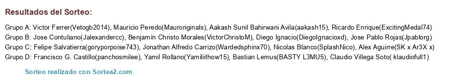 Lista de participantes: Aakash Sunil Bahirwani Avila(aakash15), Alex Aguirre(SK x Ar3X x), Bastian Lemus(BASTY L3MU5), Benjamín Christo Morales(VictorChristoM), Claudio Villega Soto( klaudiofull1), Diego Ignacio(DiegoIgnacioxd), Felipe Salvatierra(goryporpoise743), Francisco G. Castillo(panchosmilee), Jonathan Alfredo Carrizo(Wardedsphinx70), Jose Contuliano(Jalexandercc), Jose Pablo Rojas(Jpablorg), Mauricio Peredo(Mauroriginals), Nicolas Blanco(SplashNico), Ricardo Enrique(ExcitingMedal74), Victor Ferrer(Vetogb2014), Yamil Rollano(Yamiliithow15).