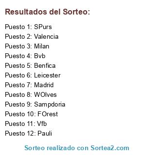 Lista de participantes: Valencia, SPurs, Leicester, Vfb, Sampdoria, FOrest, Milan, Madrid, Pauli, Benfica, WOlves, Bvb.