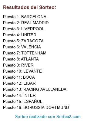 Lista de participantes: TOTTENHAM, BARCELONA, LEVANTE, VALENCIA, ATLANTA, ÍNTER, LIVERPOOL, UNITED, ESPAÑOL, REAL MADRID, BOCA, RIVER, ZARAGOZA, EIBAR, RACING AVELLANEDA, BORUSSIA DORTMUND.