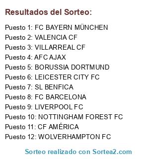 Lista de participantes: VILLARREAL CF, FC BARCELONA, LEICESTER CITY FC, VALENCIA CF, LIVERPOOL FC, SL BENFICA, CF AMÉRICA, WOLVERHAMPTON FC, NOTTINGHAM FOREST FC, BORUSSIA DORTMUND, FC BAYERN MÜNCHEN, AFC AJAX.