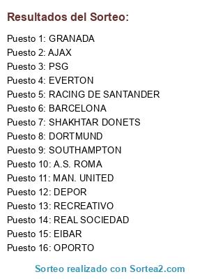 Lista de participantes: RECREATIVO, SOUTHAMPTON, A.S. ROMA, MAN. UNITED, SHAKHTAR DONETS, AJAX, RACING DE SANTANDER, GRANADA, DORTMUND, DEPOR, EVERTON, PSG, REAL SOCIEDAD, BARCELONA, EIBAR, OPORTO.
