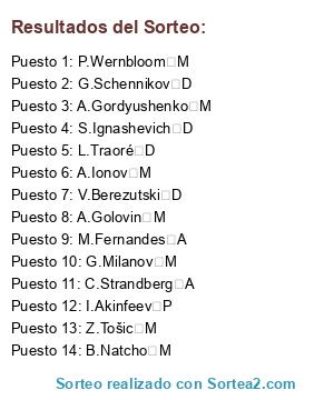 Lista de participantes: A.Golovin M, A.Ionov M, A.Gordyushenko M, B.Natcho M, C.Strandberg A, G.Milanov M, G.Schennikov D, I.Akinfeev P, L.Traoré D, M.Fernandes A, P.Wernbloom M, S.Ignashevich D, V.Berezutski D, Z.Tošic M.