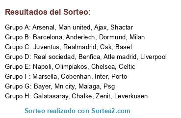 Lista de participantes: Barcelona, Realmadrid, Arsenal, Chelsea, Man united, Atle madrid, Psg, Bayer, Dormund, Napoli, Milan, Inter, Juventus, Liverpool, Galatasaray, Mn city, Chalke, Leverkusen, Ajax, Celtic, Olimpiakos, Csk, Porto, Benfica, Cobenhan, Anderlech, Malaga, Marsella, Real sociedad, Shactar, Basel, Zenit.