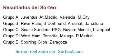 Lista de participantes: R.Madrid, B.Dortmund, Mallorca, Zaragoza, Liverpool, Valencia, Manchester Utd, Bayern Munich, Barcelona, Chelsea, River Plate, Arsenal, PSG, Juventus.