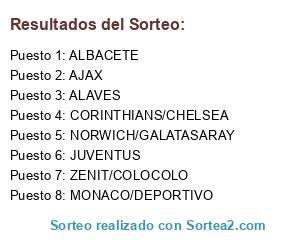 Lista de participantes: MONACO/DEPORTIVO, ZENIT/COLOCOLO, JUVENTUS, ALBACETE, CORINTHIANS/CHELSEA, NORWICH/GALATASARAY, AJAX, ALAVES.
