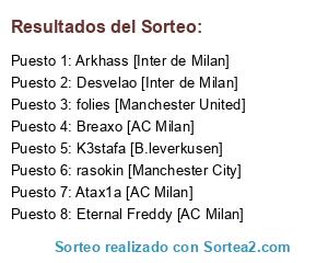 Lista de participantes: Atax1a [AC Milan], rasokin [Manchester City], Breaxo [AC Milan], Arkhass [Inter de Milan], Eternal Freddy [AC Milan], folies [Manchester United], Desvelao [Inter de Milan], K3stafa [B.leverkusen].