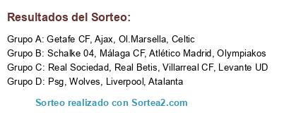 Lista de participantes: Málaga CF, Real Sociedad, Psg, Ajax, Villarreal CF, Getafe CF, Real Betis, Olympiakos, Atlético Madrid, Schalke 04, Celtic, Ol.Marsella, Liverpool, Atalanta, Levante UD, Wolves.
