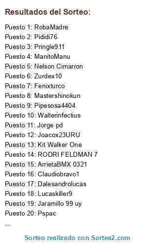 Lista de participantes: KarecOne8, EL TUCU 01, RODRI FELDMAN 7, Lucaskiller9, Niko451, ManitoManu, Mastershinokun, Jaramillo 99 uy, Pipesosa4404, Pringle911, Matata77, Nelson Cimarron, Kit Walker One, Santisarubbi, MosqueteroSHIRU, Jorge pd, Joacox23URU, Zurdex10, Bengamer777, Pididi76, Fenixturco, ArrietaBMX 0321, Gonzalosalto, Claudiobravo1, Pspac, Gonzalito55, Santiaguitoel13, Ferx05, Dalesandrolucas, RobaMadre, Migueluruguay1, Walterinfectius.