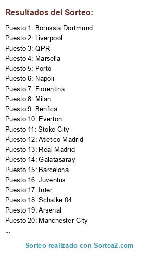 Lista de participantes: QPR, Liverpool, Arsenal, Barcelona, Stoke City, Atletico Madrid, Inter, Porto, Marsella, Manchester City, Juventus, Real Madrid, Fiorentina, Galatasaray, Benfica, Schalke 04, Milan, Roma, Borussia Dortmund, Napoli, Everton.