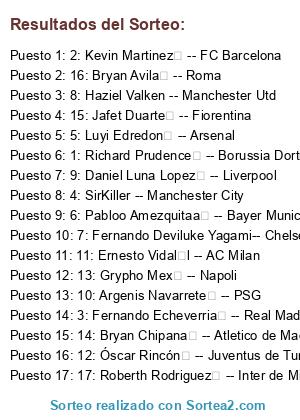 Lista de participantes: 1: Richard Prudence -- Borussia Dortmund, 2: Kevin Martinez -- FC Barcelona, 3: Fernando Echeverria -- Real Madrid FC, 4: SirKiller -- Manchester City, 5: Luyi Edredon -- Arsenal, 6: Pabloo Amezquitaa -- Bayer Munich, 7: Fernando Deviluke Yagami-- Chelsea, 8: Haziel Valken -- Manchester Utd, 9: Daniel Luna Lopez -- Liverpool, 10: Argenis Navarrete -- PSG, 11: Ernesto Vidall -- AC Milan, 12: Óscar Rincón -- Juventus de Turín, 13: Grypho Mex -- Napoli, 14: Bryan Chipana -- Atletico de Madrid, 15: Jafet Duarte -- Fiorentina, 16: Bryan Avila -- Roma, 17: Roberth Rodriguez -- Inter de Milano..