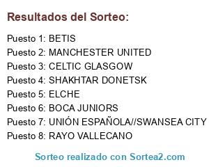 Lista de participantes: BOCA JUNIORS, SHAKHTAR DONETSK, BETIS, ELCHE, RAYO VALLECANO, CELTIC GLASGOW, MANCHESTER UNITED, UNIÓN ESPAÑOLA//SWANSEA CITY.
