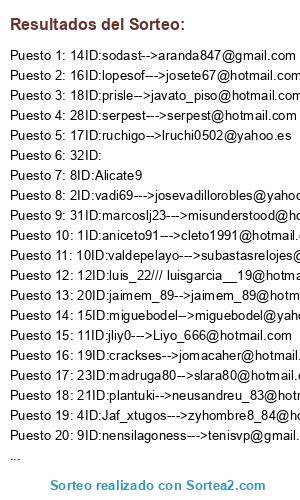 Lista de participantes: @cleto1991, @josevadillorobles, @yoqse, @zyhombre8_84, 5ID:Hybrid1427 , 6ID:S-t-o-n-e-d-1, @el_boss007, 8ID:Alicate9, @tenisvp, @subastasrelojes, @Liyo_666, @luisgarcia__19, @fitipaldi_76, @aranda847, @miguebodel, @josete67, @lruchi0502, @javato_piso, @jomacaher, @jaimem_89, @neusandreu_83, @el_king_riki, @slara80, @luchiferoir, @javiere_1995, @kiliaan_10, @orbeu, @serpest, @Salem6669, @danielhasky, @misunderstood, 32ID:, .