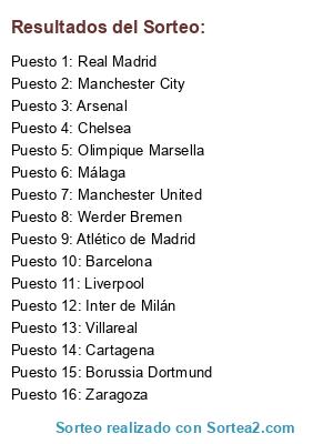 Lista de participantes: Chelsea, Málaga, Olimpique Marsella, Werder Bremen, Inter de Milán, Atlético de Madrid, Villareal, Real Madrid, Arsenal, Manchester United, Liverpool, Barcelona, Cartagena, Zaragoza, Borussia Dortmund, Manchester City.