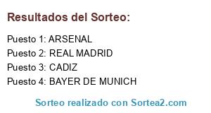 Lista de participantes: ARSENAL, CADIZ, REAL MADRID, BAYER DE MUNICH.