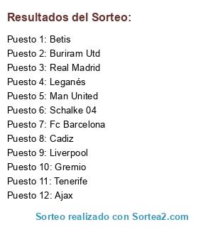 Lista de participantes: Schalke 04, Ajax, Real Madrid, Fc Barcelona, Tenerife, Cadiz, Buriram Utd, Liverpool, Man United, Gremio, Leganés, Betis.