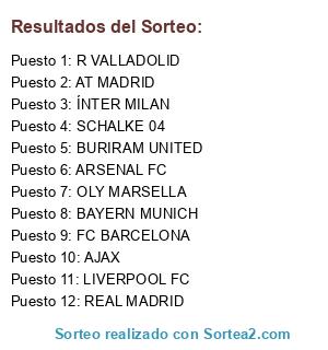 Lista de participantes: FC BARCELONA, ARSENAL FC, REAL MADRID, AT MADRID, AJAX, OLY MARSELLA, BURIRAM UNITED, SCHALKE 04, ÍNTER MILAN, R VALLADOLID, BAYERN MUNICH, LIVERPOOL FC.