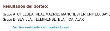 Lista de participantes: BAYERN MUNICH, CHELSEA, BENFICA, REAL MADRID, FLUMINENSE, SEVILLA, AJAX, MANCHESTER UNITED.