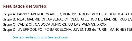 Lista de participantes: FC BARCELONA, CLUB ATLETICO DE MADRID, REAL MADRID CF, MANCHESTER CITY CF, RCD ESPANYOL, UD LAS PALMAS, ARSENAL CF, ATHLETIC CLUB, SL BENFICA, BORUSSIA DORTMUND, LIVERPOOL FC, CADIZ CF, CA BOCA JUNIORS, PARIS SAINT-GERMAIN FC, JUVENTUS de TURIN, XXXX.