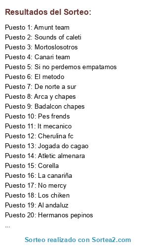 Lista de participantes: Agresividad charrua, Mortoslosotros, Sounds of caleti, Atletic almenara, Al andaluz, It mecanico, Cherulina fc, Jogada do cagao, De norte a sur, La canariña, Amunt team, Pit i cullons, El metodo, Si no perdemos empatamos, Hermanos pepinos, Pes frends, Los chiken, Canari team, No mercy, Arca y chapes, Los maños del pes, Corella, Badalcon chapes, Los chaveas.