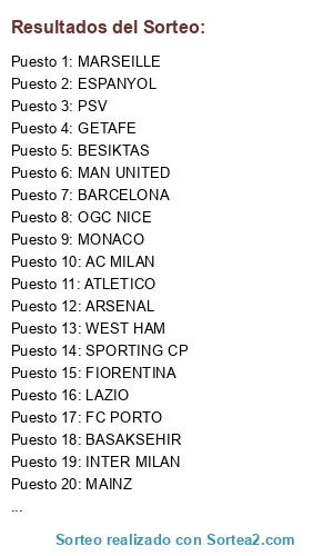 Lista de participantes: ARSENAL, ATLETICO, BORDEAUX, WEST HAM, AUGSBURG, LAZIO, NAPOLI, GETAFE, BAYERN MUNICH, AC MILAN, BENFICA, BASAKSEHIR, MARSEILLE, OGC NICE, INTER MILAN, PSV, MAN UNITED, FC PORTO, BESIKTAS, BVB, BMG, WATFORD, MAINZ, BARCELONA, MONACO, SPORTING CP, LIVERPOOL, AJAX, FIORENTINA, ESPANYOL.