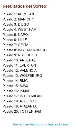 Lista de participantes: TOTTENHAM, LILLE, NAPOLI, WOLFSBURG, BAYERN MUNICH, ISMAEL, MAN CITY, BMG, ATLETICO, DESMOND, LYONNAIS, RB LEIPZIG, INTER MILAN, CRYSTAL PALACE, VALENCIA, SCHALKE, ARSENAL, WEST HAM, DIEGO, CELTA, EVERTON, AJAX, ATALANTA, AC MILAN.