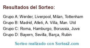 Lista de participantes: Hamburgo, Borussia, Werder, Bayern, Juve, Rubin, Roma, Milan, Atleti, Sevilla, Barça, Madrid, Liverpool, Man. Utd, A. Villa, Tottenham.