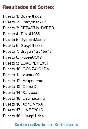 Lista de participantes: Feliperemix, CirosxD, LOKOPEPE991, RyougaMaster, Xalvixxx, Juanpi Ldea, Uzumasama, GusyElLobo, GONZ4LOLDA, Gharyxhack12, HMBE2015, SEB4STIANWEED, Brayan 12345678, Bcaterthugz, Xx7OMYxX, RubenUC17, Tito141085, Manuto02.