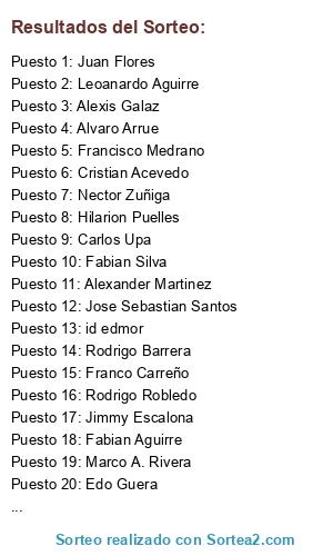 Lista de participantes: Fabian Bonino , Alvaro Arrue , Rodrigo Barrera , Sebastia Carreño , Yeyson Diaz , Edo Guera , id edmor , Negros Cortés , Juan Flores , Fabian Aguirre , Cristian Acevedo , Jimmy Escalona , Nector Zuñiga , Michael Gonzalez , Pablo Ortiz , Miguel Lanzarini , Sebastian Gutierrez , Leoanardo Aguirre , Francisco Medrano , Marco A. Rivera , David Montero , Rodrigo Robledo , Xoro gio, Carlos Upa , Eduardo Michue , Franco Carreño , Hilarion Puelles , Alexis Galaz , Ruben Lopez , Fabian Silva , Alexander Martinez , Jose Sebastian Santos.