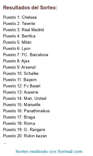 Lista de participantes: Panathinaikos, G. Rangers, Rubin kazan, FC. Barcelona, Twente, W. Bremen, Schalke, Man. United, Internazionale, Tottenham, Lyon, Benfica, Roma, Fc Basel, Bayern, Spartak Moskva, Marseille, Chelsea, Ajax, Auxerre, Real Madrid, Milan, Braga, Arsenal.