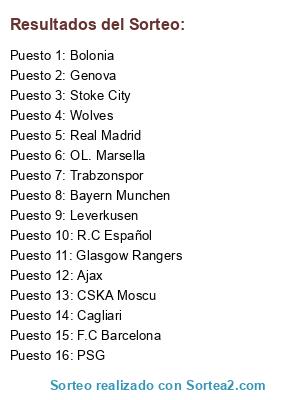 Lista de participantes: Real Madrid, PSG, Glasgow Rangers, F.C Barcelona, Cagliari, Leverkusen, OL. Marsella, Bayern Munchen, Bolonia, Ajax, CSKA Moscu, Wolves, R.C Español, Stoke City, Trabzonspor, Genova.