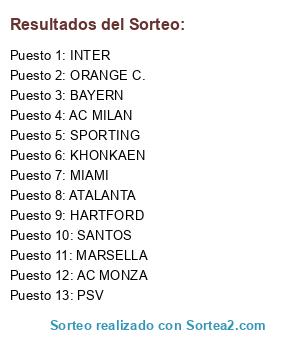 Lista de participantes: AC MILAN, AC MONZA, ATALANTA, BAYERN, HARTFORD, INTER, KHONKAEN, MIAMI, MARSELLA, ORANGE C., PSV, SANTOS, SPORTING.