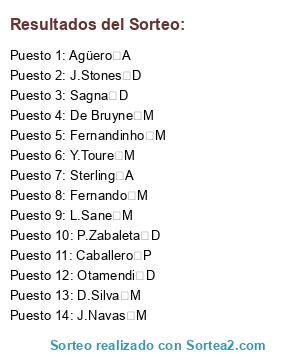 Lista de participantes: Agüero A, Caballero P, D.Silva M, De Bruyne M, Fernandinho M, Fernando M, J.Navas M, J.Stones D, L.Sane M, Otamendi D, P.Zabaleta D, Sagna D, Sterling A, Y.Toure M.