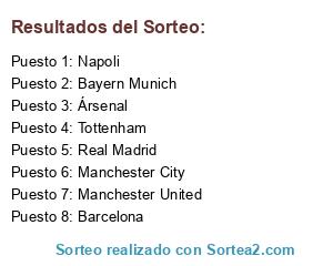 Lista de participantes: Barcelona, Manchester City, Manchester United, Bayern Munich, Tottenham, Real Madrid, Ársenal, Napoli.